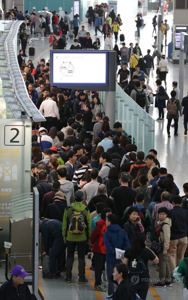 5월초 황금연휴를 앞두고 27일 오전 인천공항 출국장에서 여행객들이 줄서고 있다.