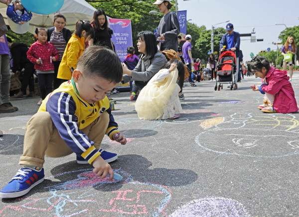 | ▲ 지난해 열린 서울동화축제에서 어린이가 도로에 그림을 그리고 있다.(사진제공=광진구청) | ||