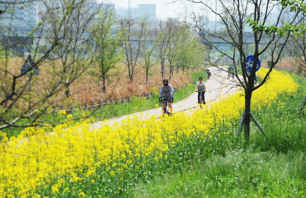 현재 동대문구 중랑천 둔치 자전거 도로 옆에는 노란 유채꽃이 만개해 장관을 이루고 있다. 사진은 지난 30일 오후 중랑천 둔치를 찾은 시민들이 여유로운 주말을 즐기는 모습.(사진제공=동대문구청)