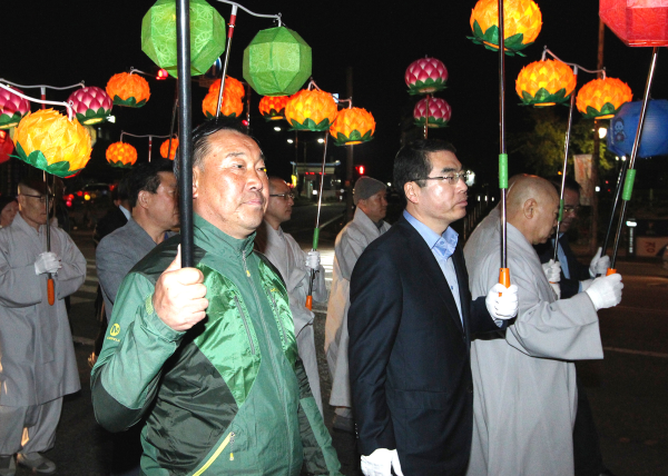 29일 광명등문화축제는 잊혀져가는 전통 등문화를 복원하고 우리 민족 고유의 전통 문화를 계승하기 위해 광명전통문화연구회가 주관 이병주 광명시의회 의장(왼쪽)과 양기대 광명시장(가운데)이 광명시민체육관 대리석광장에서 열린 '2017 광명등문화축제'에 참가해 승려들과 함께 1000여명의 시민이 전통 등을 들고 퍼레이드를 하고 있다.