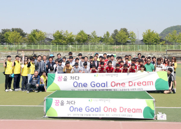 최근 경기 광명시 다목적 운동장에서 (사)새희망씨앗 주관으로 서울 금천 FC와 새희망씨앗 후원시설연합팀의 ‘One Goal One Dream’ 축구대회가 열렸다. 사진은 차성수 금천구청장(가운데)을 비롯한 선수들 및 관계자들이 기념촬영을 하는 모습.(사진제공=금천구청)