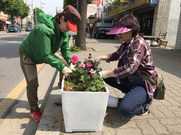 경기 수원시 팔달구 매교동에서는 지난 2일 김미경 시의원, 매교동 단체원 등 20여명이 참여해 정조로 일대 화분 60개에 제라늄 식재를 실시했다. 사진은 참여자들이 꽃을 심는 모습.(사진제공=팔달구청)
