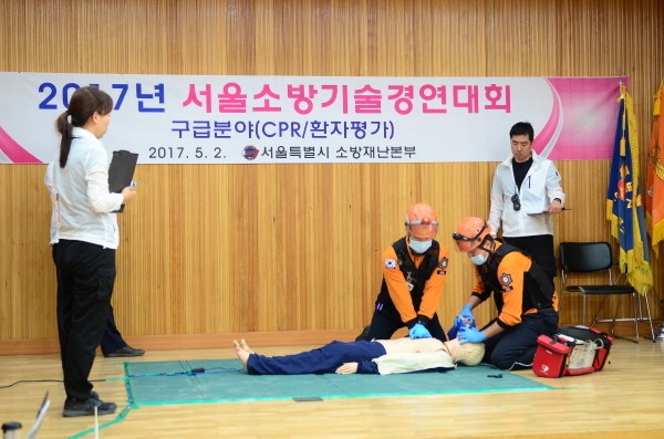 영등포소방서는 지난 2일 도봉구 방학동 구조구급센터에서 개최된 ‘2017년 소방기술경연대회’에 참가하였다. 사진은 영등포소방서 관계자들이 구급분야에서 실력을 발휘하는 모습.(사진제공=영등포소방서)