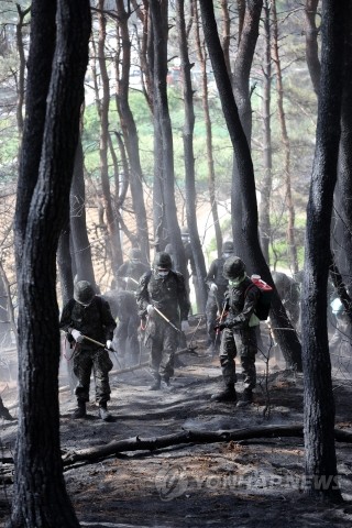 | ▲ 7일 산불이 발생한 강원 강릉시 홍제동의 산불현장에서 육군 장병들이 잔불제거 작업을 하고 있다.(사진제공=연합뉴스) | ||