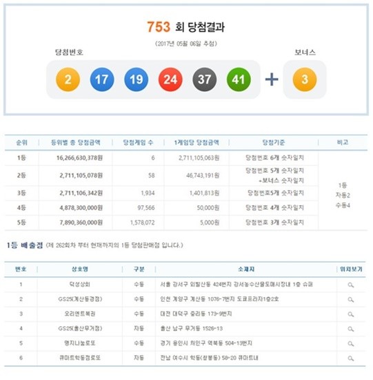 6일 나눔로또는 제753회 로또복권 추첨에서 '2, 17, 19, 24, 37, 41'번의 1등 당첨번호를 배출한 당첨판매점이 전국 6곳인 가운데 이번이 4번째 1등 배출인 인천 GS25 계산동경점(인천 계양구 계산동)이 화제가 되고 있는 것.