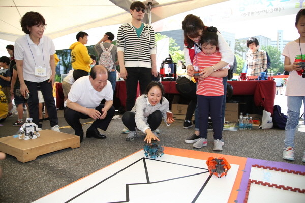 지난 5일 '2017년 마포어린이축제-마포둥이 모여라!' 축제가 열린 교통안전공단 성산자동차검사소 창의과학마당에서 박홍섭 마포구청장이 로봇 체험을 하고 있는 어린이와 함께 로봇 체험에 대해 설명을 듣고 있다.(사진제공=마포구청)