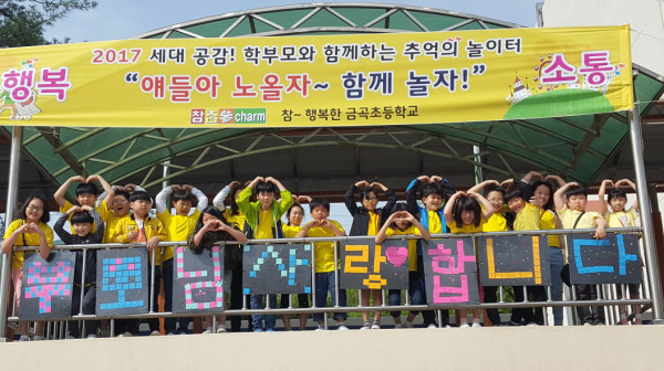 충남 아산시 금곡초등학교는 8일 가정의 달의 맞이해 전교학생회 주도로 4~6학년 학생들이 함께 만드는 어버이날 감사 캠페인 활동을 실시했다. 사진은 학생들이 '부모님 사랑합니다' 글자를 완성한 후 기념촬영을 하는 모습.(사진제공=아산교육지원청)