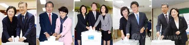더불어민주당 문재인 대선후보와 부인 김정숙씨가 제19대 대통령 선거일인 9일 서울 서대문구 홍은2동 제3투표소에서 투표하고 있다. 자유한국당 홍준표 대선후보가 이날 오전 서울 송파구 잠실동 송파문화원에 마련된 잠실7동 제1투표소에서 부인 이순삼씨와 함께 투표하고 있다. 국민의당 안철수 대선 후보와 부인 김미경씨(왼쪽), 딸 설희씨(오른쪽)가 오전 서울 노원구 상계1동 제7투표소인 극동늘푸른아파트 경로당에서 투표하고 있다. 바른정당 유승민 대선후보가 오전 대구시 동구 용계동 반야월농협 용계지점에서 부인 오선혜씨와 함께 투표하고 있다. 정의당 심상정 대선후보가 경기도 고양시 신원초등학교에서 남편 이승배씨와 함께 투표하고 있다.
