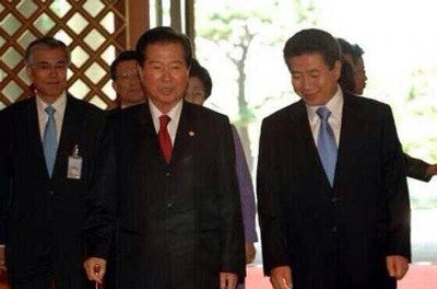 공개된 사진은 故 김대중, 노무현 전 대통령이 대화를 나누고 있는 모습이며 이들의 뒤편으로 문재인 대통령이 서 있는 모습이다.