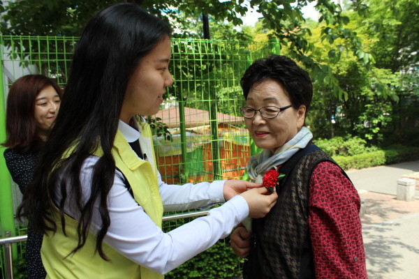 지난 8일 서울시립강동노인종합복지관이 어버이날을 기념해 ‘명일여고와 함께하는 카네이션 달아드리기’ 행사를 실시했다. 사진은 명일여자고등학교 학생이 한 노인에게 카네이션을 달아주고 있는 모습.(사진제공=강동노인복지관)