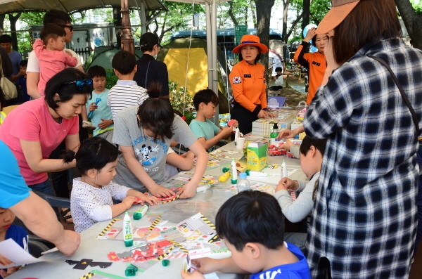 영등포소방서는 최근 어린이날을 맞이해 국회 어린이 동심한마당 행사에서 여러 가지의 소방차량에 대한 종이접기를 실시했다. 사진은 어린이들이 부모와 함께 열심히 종이접기를 하는 모습.(사진제공=영등포소방서)