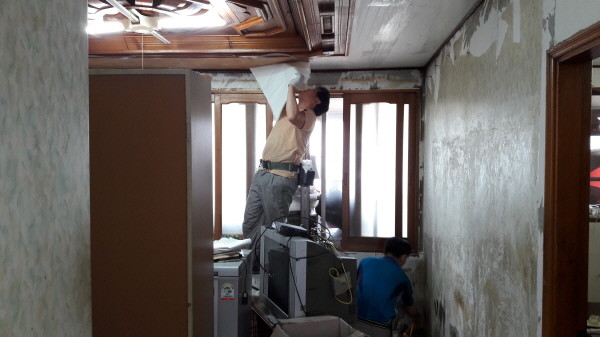 경기 이천시는 저소득층의 주거복지 사각지대 해소를 위한 희망하우징 사업의 일환으로 지난 9일 단월동 거주 홀몸노인 집을 방문해 주거환경 개선을 실시했다. 사진은 참여자들이 도배 작업을 진행하는 모습.(사진제공=이천시청)