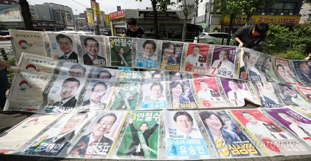 10일 오전 서울 종로구 혜화동 로터리 인근에서 혜화동주민센터 관계자가 제19대 대통령 선거 벽보 철거작업을 하고 있다.