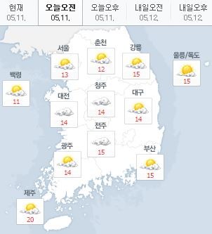 11일 현재 서울은 13도, 춘천 12도, 대전 14도, 광주 14도, 부산 15도, 제주 20도를 기록 중이다.