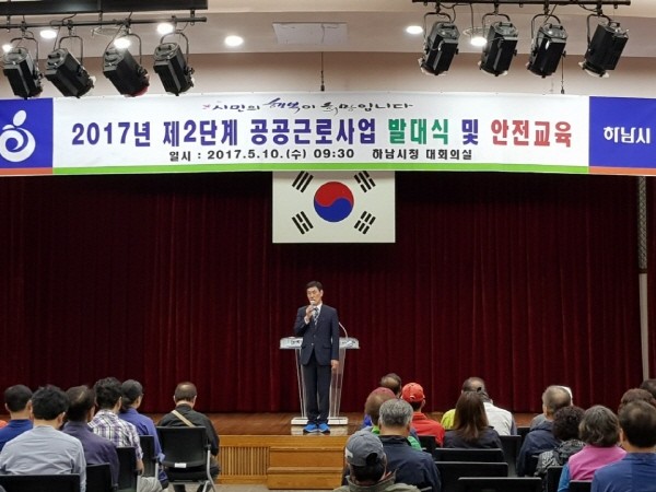 경기 하남시는 지난 10일 시청 대회의실에서 공공근로사업 참여자 및 사업담당자 등 80여명이 참석한 가운데 제2단계 공공근로사업 발대식을 가졌다. 사진은 오수봉 시장이 인사말을 하는 모습.(사진제공=하남시청)