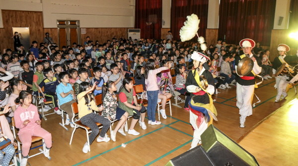 인천 계양구는 지난 10일 귤현초등학교에서 학업에 지친 학생들의 심신을 위로하는 힐링의 자리를 마련하기 위한 '스쿨 樂 콘서트'를 개최했다. 사진은 사물놀이 공연이 진행 중인 모습.(사진제공=계양구청)