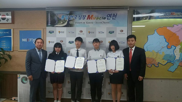 경기 연천군은 지난 11일 (사)희망을나누는사람들로부터 청소년 장학금을 기탁 받아 지역내 저소득 취약계층 청소년들에게 장학금을 전달했다. 사진은 장학금 전달식 후 학생들과 김규선 군수(왼쪽) 등 관계자가 기념촬영을 하는 모습.(사진제공=연천군청)