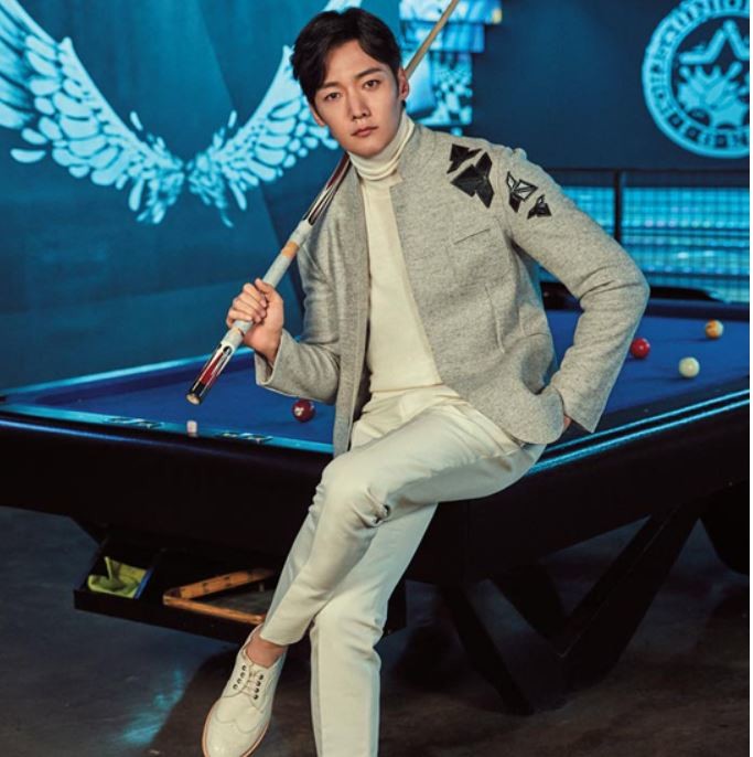 사진 속 최진혁은 당구대를 배경으로 큣대를 들고 물끄러미 카메라를 바라보고 있다.