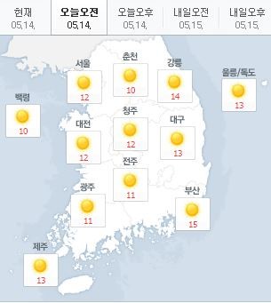 현재 서울 12도 춘천 10도, 대전 12도, 광주 11도, 부산 15도, 제주 13도를 기록 중이다.