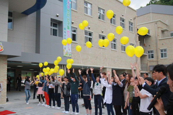 충남 아산시 용화동에 위치한 아산초등학교는 최근 꿈빛나래관에서 개교식을 개최했다. 사진은 개교식에 참석한 학생들과 관계자들이 축하 풍선을 날리며 즐거워하는 모습.(사진제공=아산교육지원청)