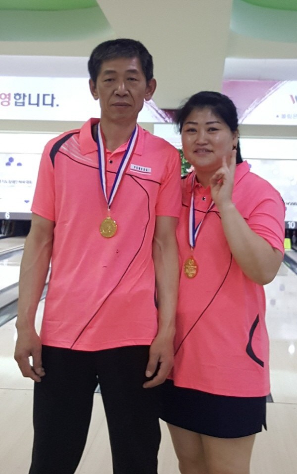 경기 양주시 장애인체육회는 지난 11~13일 사흘간 화성시에서 개최된 '제7회 경기도 장애인 체육대회'에서 금 5개, 은 6개, 동 5개 등 총 16개의 메달을 획득했다. 사진은 볼링 청각 남·여 개인전에서 동반 금메달을 획득한 장진구·최선경 부부가 기념촬영을 하는 모습.(사진제공=양주시청)