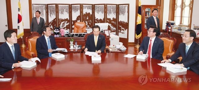 정세균 국회의장(가운데)이 15일 오전 서울 여의도 국회의장실에서 19대 대선 뒤 첫 원내대표 회동을 갖던 중 각 교섭단체 원내대표에게 새정부 출범에 즈음한 입법 및 정책과제집을 전달한 뒤 함께 책자를 검토하고 있다. 왼쪽부터 국민의당 주승용, 더불어민주당 우상호 원내대표, 정 의장, 자유한국당 정우택, 바른정당 주호영 원내대표.