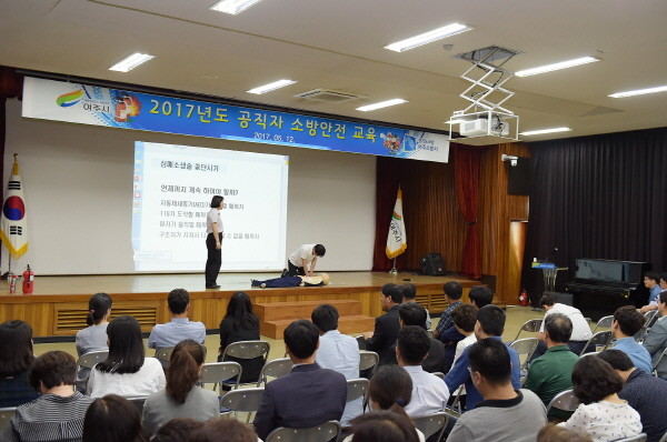 경기 여주시는 최근 시 공직자를 대상으로 시청 강당에서 화재발생시 신속한 대응 강화를 위한 소방안전교육을 실시했다. 사진은 소방안전교육 관계자가 교육 참가자들을 대상으로 심폐소생술 방법에 대해 교육하고 있는 모습.(사진제공=여주시청)