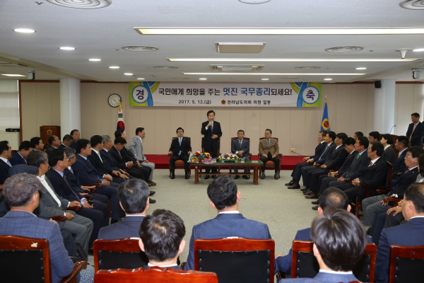 | ▲ 사진설명=이낙연 국무총리 내정자가 지난 13일 전남도의회를 방문, 임명규 의장과 의원들이 참석한 가운데 퇴임인사를 전하고 있다. | ||