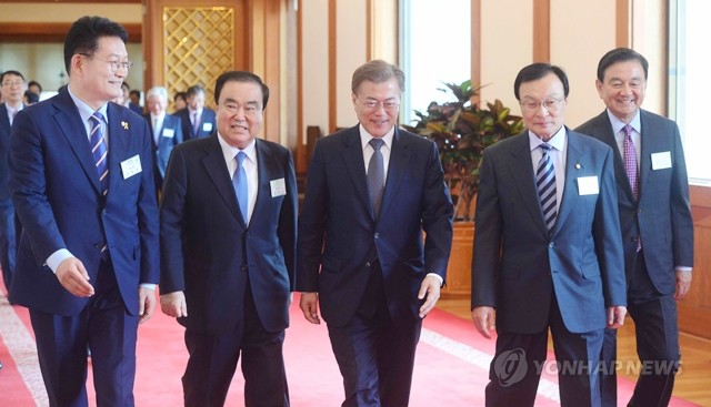 문재인 대통령이 16일 오전 청와대 본관 충무실에서 미·중·일·러 ·유럽연합 주요국 특사단과 오찬 간담회를 하기 위해 인왕실로 향하고 있다. 왼쪽부터 송영길 러시아특사, 문희상 일본특사, 문 대통령, 이해찬 중국특사, 홍석현 미국특사.