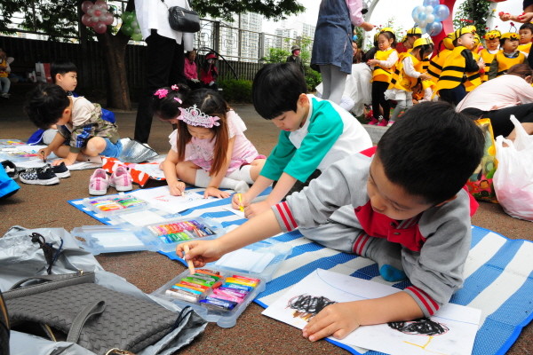 서울 중랑구는 중랑구주부환경봉사단과 함께 지난 15일 중랑천 묵동 수림대공원에서, 유치원생 100여명이 참여한 가운데 '낭비되는 에너지 내가 지킨다'라는 주제로 '2017 중랑 꿈나무 초록에너지 그림 한마당'을 개최했다. 사진은 어린이들이 열심히 그림을 그리는 모습.(사진제공=중랑구청)