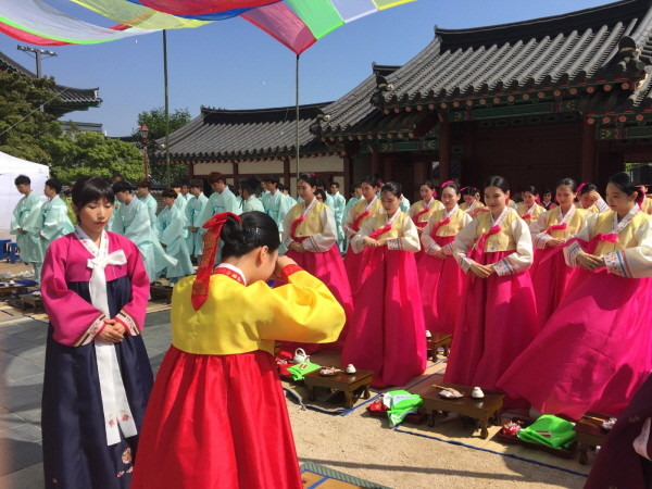 인천 남구는 지난 15일 인천도호부청사 동헌 마당에서 올해 성년을 맞은 인천재능대학교 항공운항서비스과 여학생 25명과 정보통신과 남학생 25명 등 재학생 50명이 참석한 가운데 ‘제6회 전통 성년례’를 개최했다. 사진은 술 마시는 예법을 일러주는 내초례 행사가 진행 중인 모습.(사진제공=남구청)
