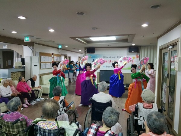경기 수원시 권선구 복조리 공연단 30여명은 17일 권선동 노인보호센터를 방문해 노인들에게 따뜻한 나눔 공연을 선사했다. 사진은 공연단이 한국무용을 선보이는 모습.(사진제공=권선구청)
