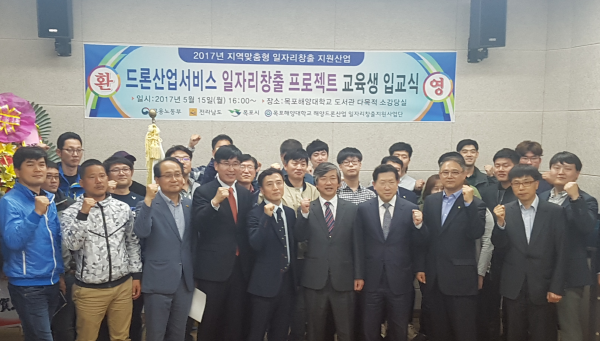 전남 목포시는 지난 15일 목포해양대학교에서 1기 교육생 21명이 참석한 가운데 '2017 지역산업맞춤형 일자리창출사업 드론 조종·조립·정비 전문가 양성 교육 입교식'을 개최했다. 사진은 관계자들이 기념촬영을 하는 모습.(사진제공=목포시청)