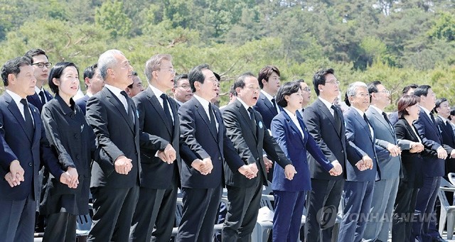 문재인 대통령과 여·야 지도부 등 참석자들이 18일 오전 광주 국립 5.18 민주묘지에서 열린 제37주년 5.18 민주화운동 기념식에서 `님을 위한 행진곡'을 함께 부르고 있다.
