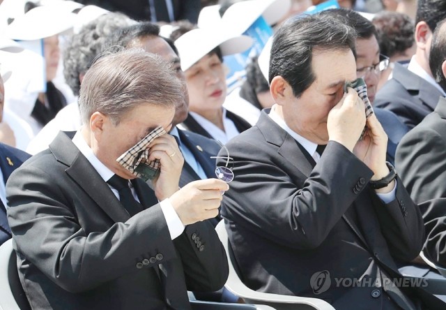문재인 대통령과 정세균 국회의장이 18일 오전 광주 국립 5.18 민주묘지에서 열린 제37주년 5.18 민주화운동 기념식에서 눈물을 닦고 있다.