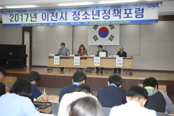 경기 이천시는 지난 18일 시청 대회의실에서 ‘2017년 이천시청소년정책포럼’을 개최했다. 사진은 중앙대 사회복지학과 황환 교수, 이천시대학생연대 김지현, 한국청소년정책연구원 장근영 박사, 시청소년육성재단 조계형 사무국장 등이 발표하는 모습.(사진제공=이천시청)