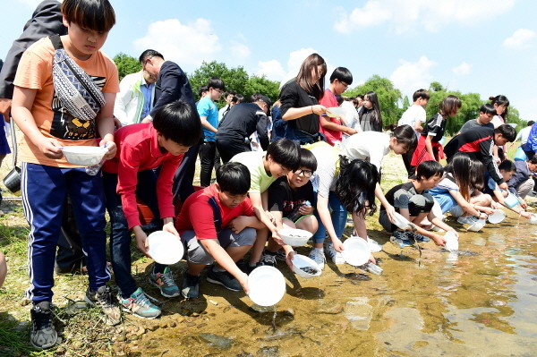 경기 여주시는 최근 신륵사 인근 남한강변에서 우리나라 토종어종인 동자개와 대농갱이 등 수산 종자 22만마리를 방류했다. 사진은 행사에 참여한 청소년들이 수산종자를 방류하고 있는 모습.(사진제공=여주시청)