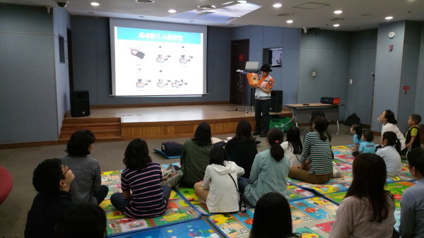 경기 용인시 기흥구 동백도서관은 지난 18일 도서관 시청각실에서 응급상황시 신속한 대처능력을 함양시키자는 취지에서 심폐소생술 교육을 실시했다. 사진은 소방대원이 심실제새동기(AED)에 대해 교육하고 있는 모습.(사진제공=용인시청)