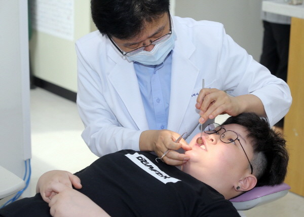 서울 금천구는 금천구 치과의사회와 공동으로 23일 오전 8시 보건소 4층 보건교육실에서 초등학생 대상 건치아동 선발대회를 개최했다. 사진은 치과의사가 학생의 치아 및 치주건강, 안면골격 발육상태 등을 평가하는 모습.(사진제공=금천구청)