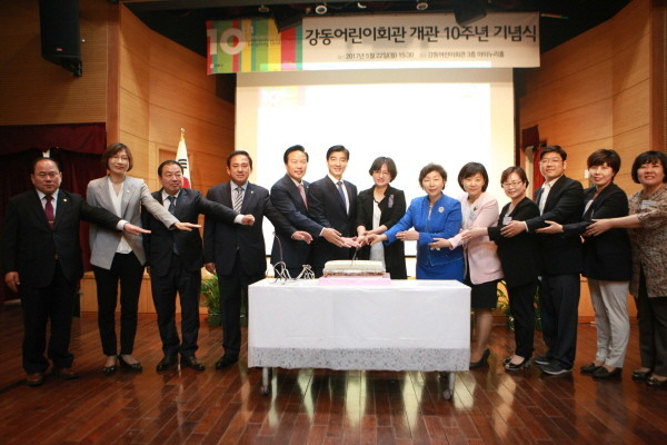 지난 22일 2007년 전국 지자체 최초로 설치, 운영돼 온 '서울 강동어린이회관 10주년 기념행사'가 개최됐다. 사진은 기념식 행사에 참석한 이해식 구청장과 조동탁 의장(왼쪽에서 여섯 번째, 다섯 번째), 강동어린이회관장, 어린이집 원장, 학부모들이 케이크를 커팅하고 있는 모습.(사진제공=강동구청)