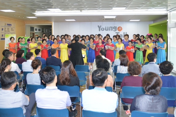 경기 수원시 영통구는 지난 22일 구청 로비 영통TALK에서 영통구 실버합창단과 함께 '5월 중 열린공간, 영통TALK 런치콘서트'를 개최했다. 사진은 점심시간을 이용해 30분간 진행된 이날 공연에서 실버합창단이 공연을 하는 모습.(사진제공=영통구청)