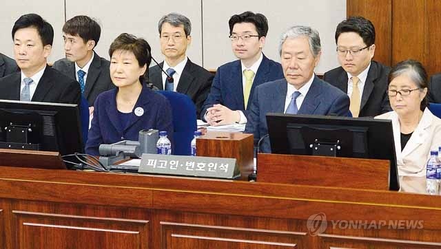 삼성 등 대기업에서 총 592억원의 뇌물을 받거나 요구·약속한 혐의 등으로 구속기소 된 박근혜 전 대통령과 '비선실세' 최순실씨, 신동빈 롯데그룹 회장이 23일 오전 서울중앙지법 417호 법정에 나란히 앉아 재판 시작을 기다리고 있다.