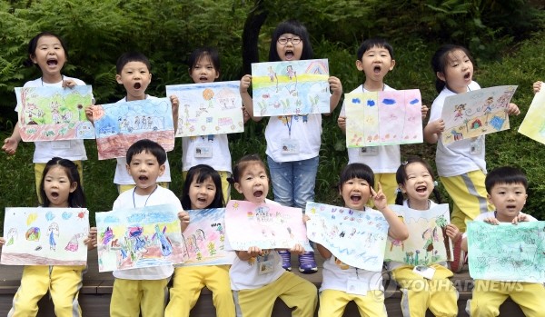 24일 서울 광진구 아차산 배드민턴장에서 '나도 피카소 꿈나무 미술경연대회'에 참여한 어린이들이 직접 그린 그림을 들어보이고 있다.