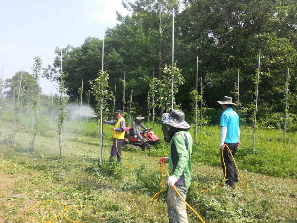 경기 연천군은 지난 23일 사과연구회와 DMZ사과영농조합법인 관계자 등이 참석한 가운데 전곡리 구석기유적지에 식재한 사과나무 과원에 대한 제초와 외래해충 방제를 실시했다. 사진은 방제활동이 진행되고 있는 모습.(사진제공=연천군청)