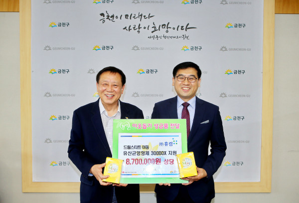금천구는 지난 22일 구청장실에서 주식회사 휴럼과 함께하는 사회공헌활동 전달식을 개최했다. 사진은 전달식에서 차성수 구청장(왼쪽)과 김진석 (주)휴럼 대표가 기념촬영을 하는 모습.(사진제공=금천구청)