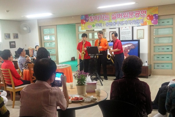 경기 용인시 수지구 동천동 주민자치위원회는 지난 23일 동문5차 아파트 경로당에서 ‘찾아가는 실버위문공연’을 개최했다. 사진은 위문공연에 참가한 주민자치위 관계자들이 색소폰 연주를 하고 있는 모습.(사진제공=용인시청)