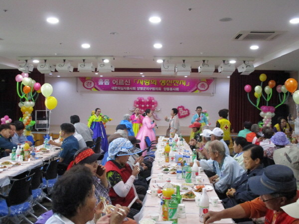 경기 양평군 양동면 적십자봉사회는 지난 19일 지역내 홀몸노인을 대상으로 ‘홀몸어르신 사랑의 생신잔치’를 개최했다. 사진은 생신잔치 행사에서 음식 나눔과 함께 국악 공연이 진행되고 있는 모습.(사진제공=양평군청)