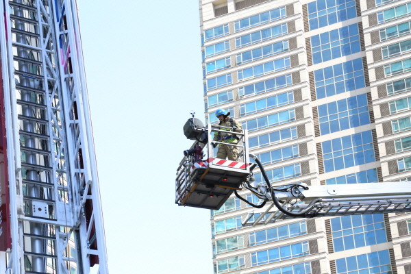 서울 강남소방서는 지난 25일 오후 강남구 도곡동 소재 타워팰리스에서 아파트 세대 내 화재발생을 가상한 재난대응훈련을 실시했다. 사진은 소방서 관계자가 고가사다리차를 이용해 구조 훈련을 하는 모습.(사진제공=강남소방서)