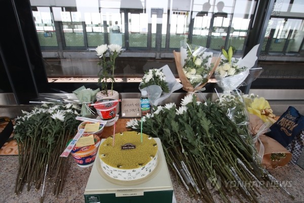 | ▲ 지하철 2호선 구의역 스크린 도어 사고 1주기를 맞아 28일 오후 서울 광진구 구의역 강변역 방면 9-4 승강장 앞에 희생자 김군의 직장 동료가 하루 앞둔 김군의 스무번째 생일을 맞아 가져다 놓은 케이크가 놓여 있다.(사진제공=연합뉴스) | ||