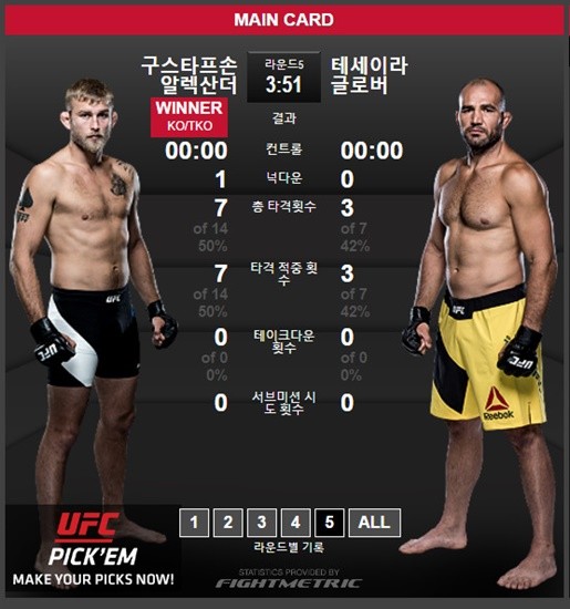구스타프손은 29일(한국 시간) 스웨덴 스톡홀름 에릭손 글로베에서 열린 UFC 파이트 나이트 109에서 랭킹 4위 글로버 테세이라(37, 브라질)에게 5라운드 1분 7초 KO로 이기며 2015년 1월 스웨덴 관중 3만 명 앞에서 앤서니 존슨에게 1라운드 TKO패 한 악몽을 벗어났지만 랭킹 2위임에도 불구하고 당장 '타이틀 샷' 얻지는 못 할 전망 인 것.